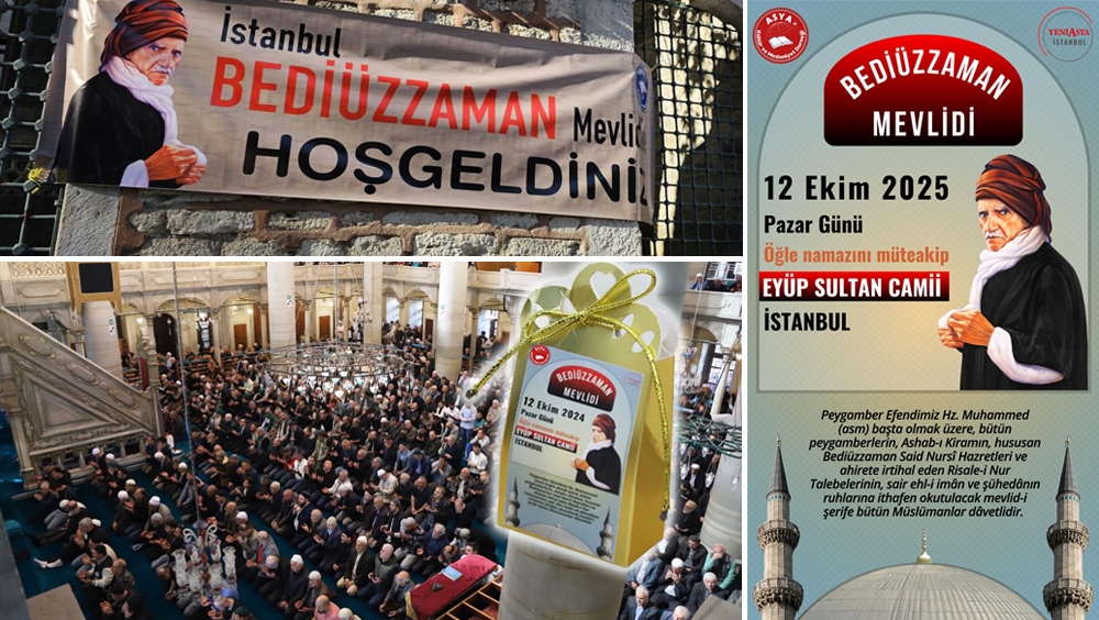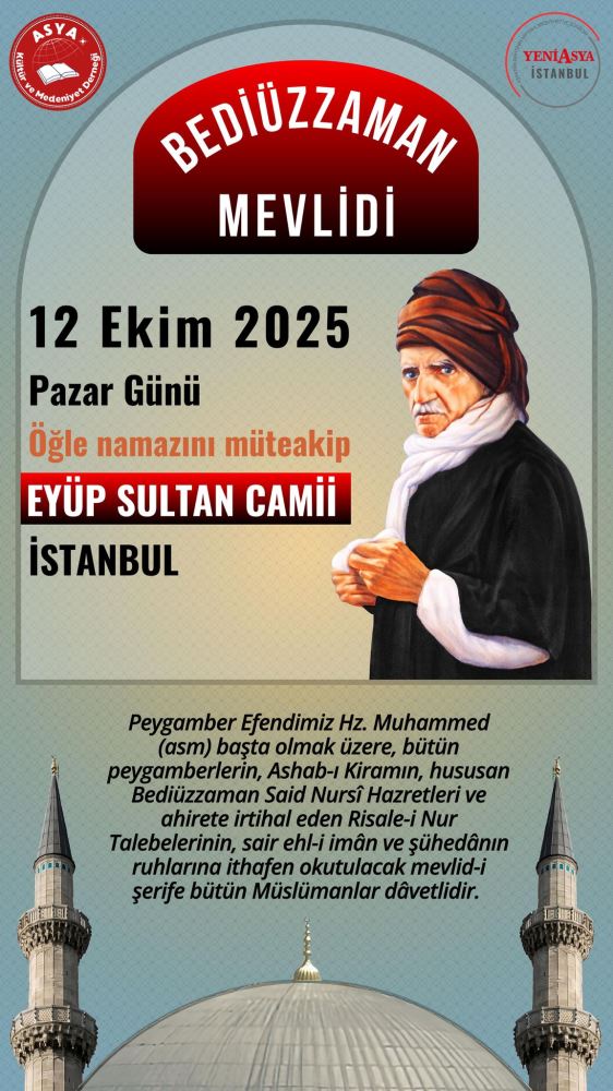 12 Ekim Pazar günü İstanbul’da Eba Eyyüb el-Ensari’nin bulunduğu Camide, Bediüzzaman Said Nursi hazretleri adına mevlid okutulacak. Buluşalım inşallah. Ecdadımıza dualar göndermek için.