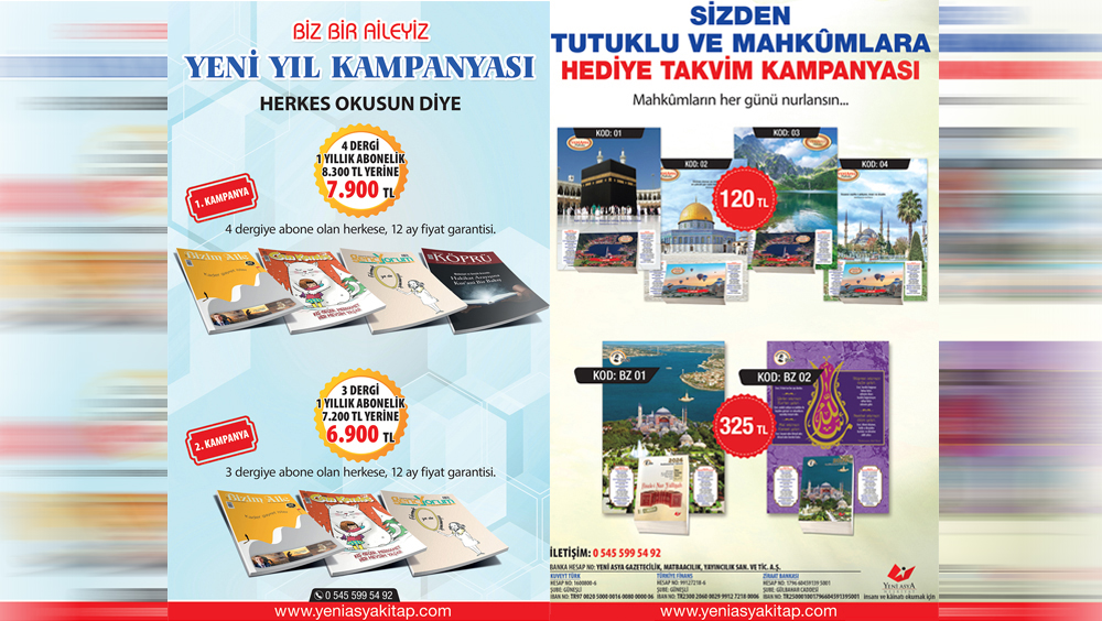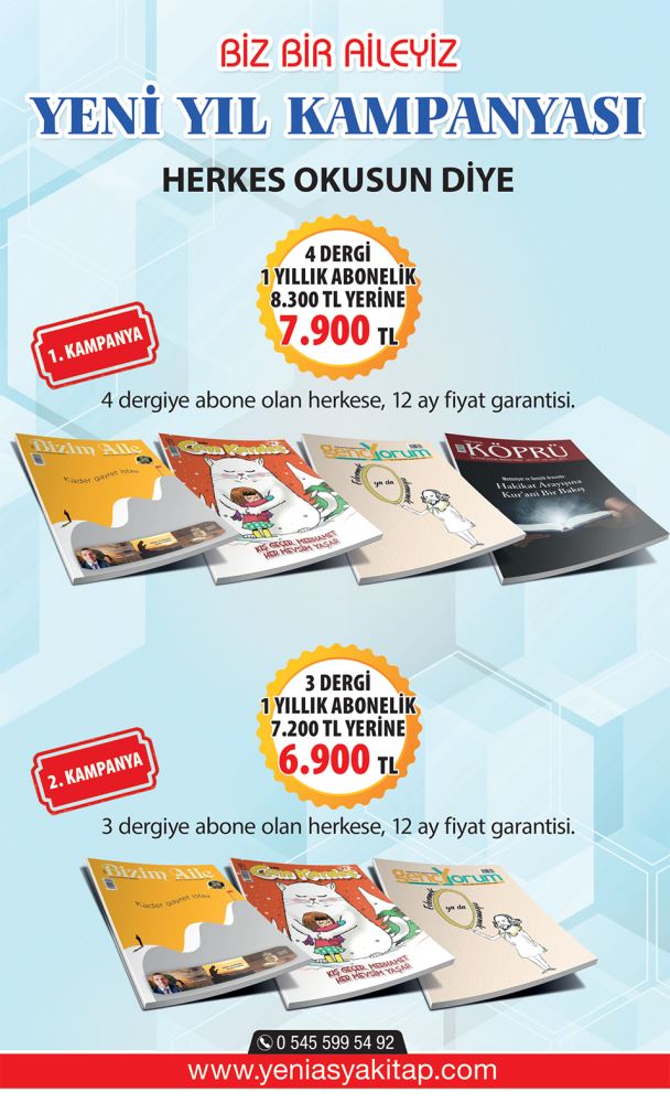 Yeni Asya Dergi Grubu olarak, “Herkes okusun diye” anlayışıyla hazırladığımız yıl sonu kampanyamızı avantajlı fiyatlarla sürdürüyoruz. Okuma kültürünü yaygınlaştırmayı hedefleyen bu kampanya ile hem yeni okuyucularımız, hem de mevcut abonelerimiz için önemli kolaylıklar sunulmakta.