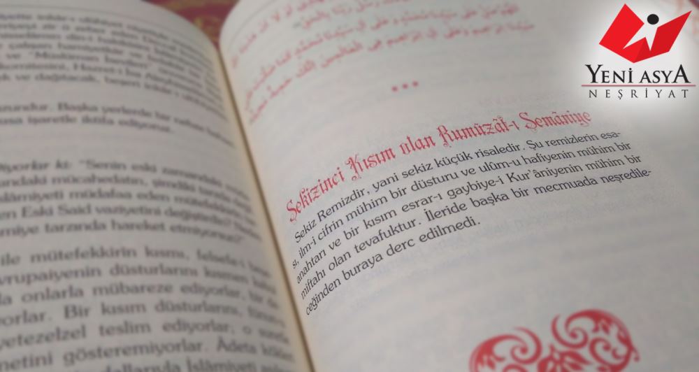 “Sekizinci Kısım olan Rumûzât-ı Semâniye: Sekiz Remizdir, yani sekiz küçük risaledir. Şu remizlerin esası, ilm-i cifrin mühim bir düsturu ve ulûm-u hafiyenin [gizli ilimlerin] mühim bir anahtarı ve bir kısım esrar-ı gaybiye-i Kur’âniyenin [Kur’ân’ın gaybî sırlarının] mühim bir miftahı [anahtarı] olan tevafuktur...”