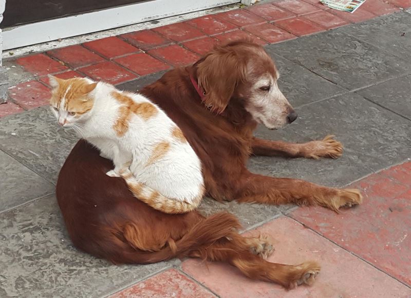 Muğla'nın Marmaris ilçesinin Kemeraltı Mahallesi'nde bir sokak köpeği ile kedinin dostluğu görenleri şaşırttı.