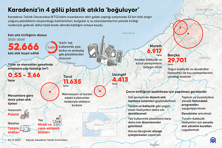 Karadeniz Teknik Üniversitesinden (KTÜ) bilim insanlarının dört gölde yaptığı çalışma, 52 bin 666 atığın çoğunu plastiklerin oluşturduğunu, iç su ekosistemlerinin plastik kirliliği nedeniyle giderek daha fazla baskı altında kaldığını ortaya koydu.