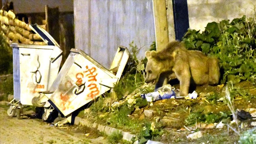 Bir süre çöp konteynerinin yanında karnını doyuran boz ayı, ardından ormanlık alana gitti.